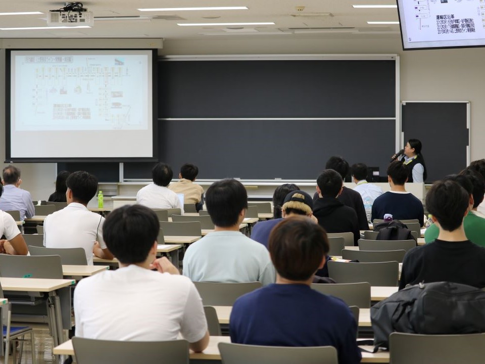 また、田中先生の3、4年生のゼミ(専門演習)の学生も参加し、司会などを務めました。お話は、「やさしい日本語」の基礎的な知識、「やさしい日本語」での車内放送の取り組みを始めたきっかけ、実際の取り組みの内容など、わかりやすいスライドと豊富な実例を交えた、とても興味深いものでした。